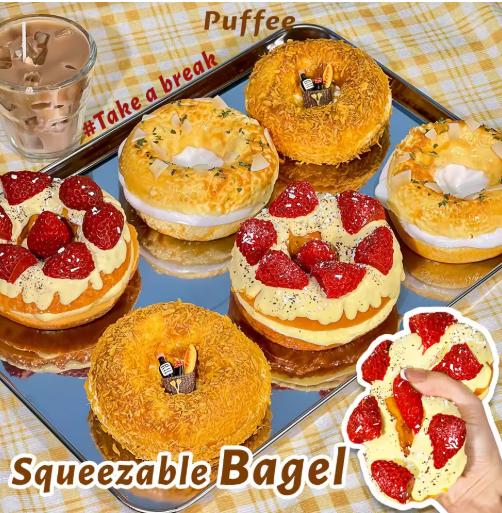 لعبة إسفنجية من السيليكون للطعام من بيجل، لعبة لاصقة كريمية ناعمة، طابا اسفنجي، خبز معسر سعيد، فراولة، كرانش، مقرمش