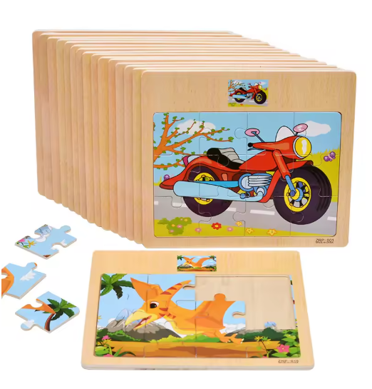 12 قطعة ألغاز خشبية ثلاثية الأبعاد للأطفال ألعاب أطفال تعليمية على شكل حيوانات ومرورات كرتونية للبيع بالجملة